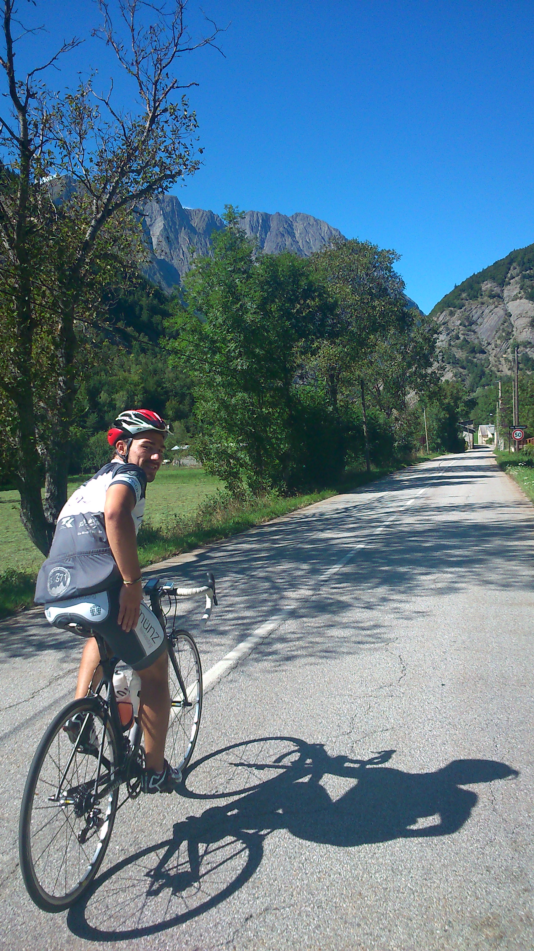 mit jeweils 1.268m und 1.371m in der Höhe sehr ansprechend. Der Wind am heutigen Tage war sehr extrem. Einerseits bestand die Überlegung, ob solch eine schwierige Etappe nicht doch besser aufgeteilt werden sollte, doch im Nachhinein konnte man sich ab und zu bei starkem Gegenwind in der Führungsarbeit abwechseln, was Kraft einspart. Es begann am Col de Manse, dass während der Abfahrt der Wind sehr stark auffrischte, so dass im Tal von Chauffayer bis Valbonnais, also ca. 60 km der Gesamtstrecke, unglaublich viel in die Beinarbeit investiert werden musste. Kaum war der Wind weg, ging es wieder die Berge hinauf. Der Col d’Ornan zog sich, doch die Abfahrt in Richtung Bourg d’Oisans, dem Start hoch zu Alpe d’Huez, war sehr schön! Breite Straßen, wenig scharfe Kurven und ein super Ausblick ins Tal, aber auch auf die noch anstehende Herausforderung: „Ist das da oben etwa Alpe d’Huez“? „Oh leck….“ 😉