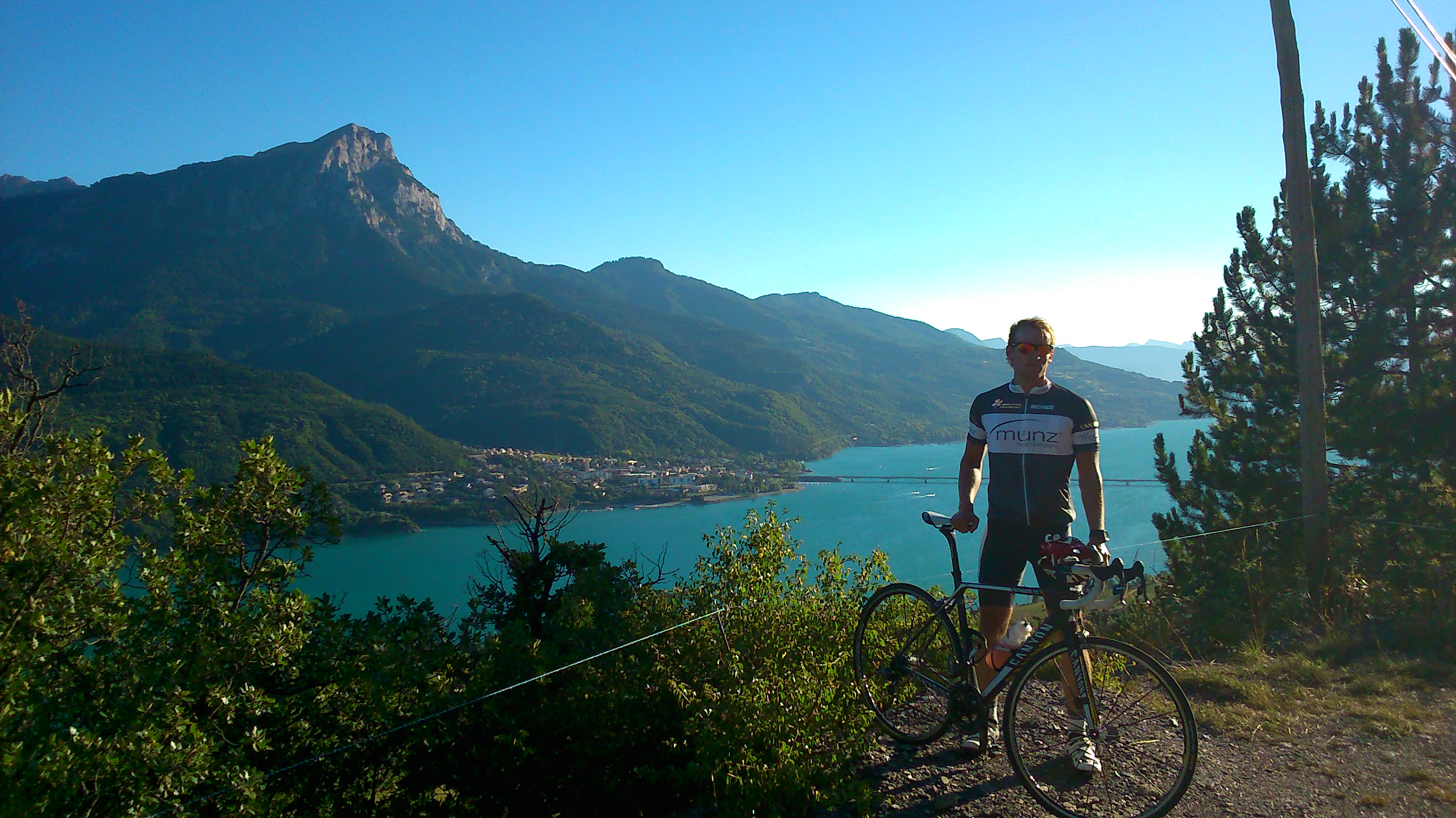 Zum Ende hin führte der Weg von Gap nochmals auf einen Berg, dem Col de Manse, um dann erneut in Gap die Zielankunft für den ersten Teil des Tages am Nachmittag zu erreichen. Das Bergzeitfahren startete in Embrun, einem kleinen Städtchen am Lac de Serre-Ponçon, eingebettet in eine hohe Berglandschaft. Trotz der 32km, die für diesen Abschnitt benötigt wurde, brauchste es doch etwas Zeit. Es ging zweimal über eine Länge von jeweils acht Kilometern auf über 1200m. Doch der Anstieg wurde mit einem traumhaften Blick über den azurblauen See bei tiefstehender Sonne belohnt. Die zweimalige Abfahrt wurde durch die schmalen Straßen von enormen Wind begleitet. Was für die Kiteboarder und Surfer auf dem Lac de Serre-Ponçon von Vorteil war, stellte für uns eine zusätzliche Anstrengung dar. Die Freude am kurvenreichen Abstieg allerdings wurde nicht getrübt.