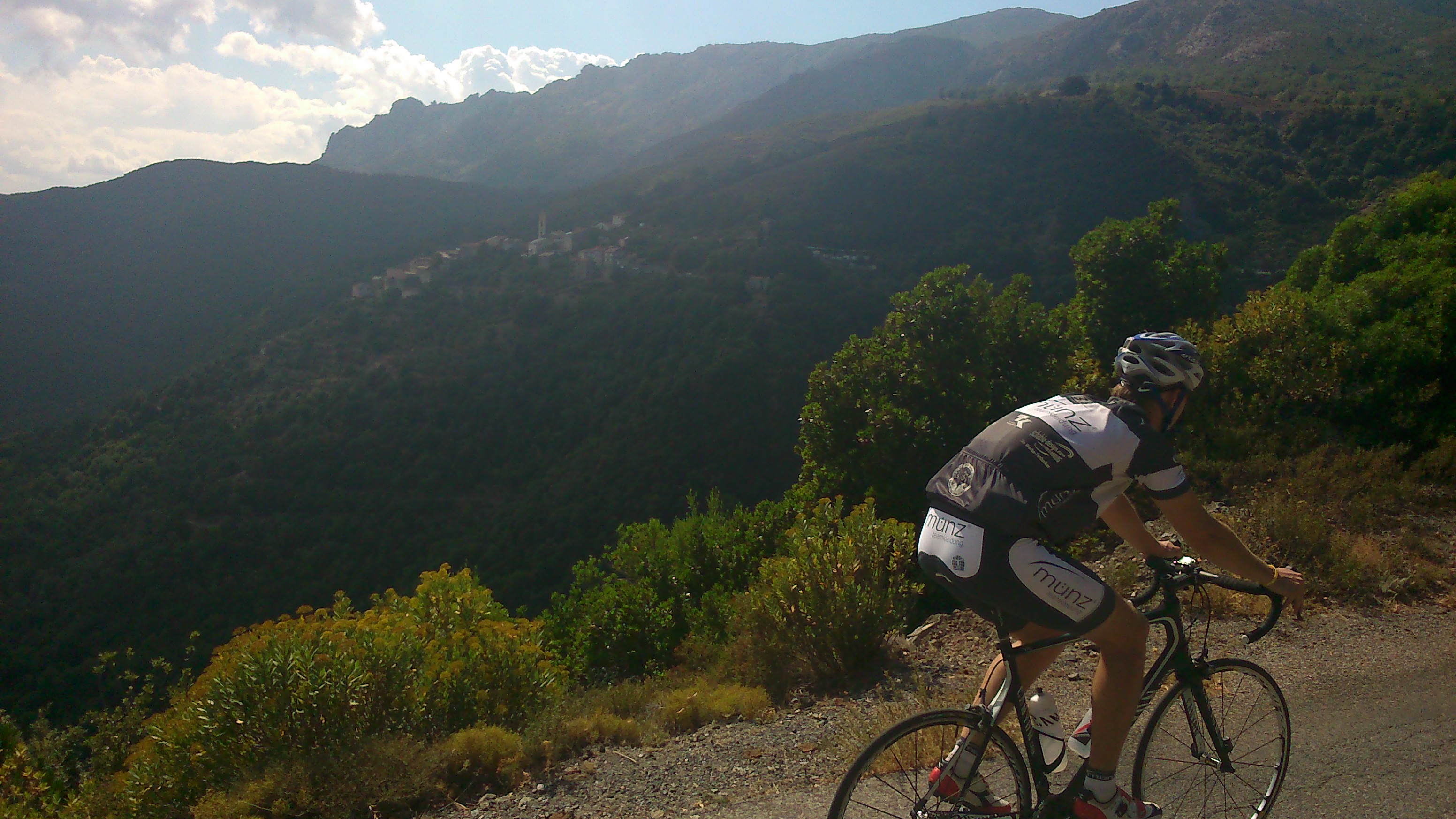 Zum Etappenabschnitt: Adrian und Fabian fuhren die 60,5 km am Samstag. Zumindest war dies der Plan. Am Ende waren es aber doch 87 km. Der Grund hierfür ist simpel und doch ärgerlich zugleich. Das GPS Gerät für das Rad zeigte die ersten 20 km einwandfrei an. Doch dann zeigte die Route Wege an, die niemals durch 150 Profis im vergangenen Jahr befahren wurden. Eine Umkehr zur Hauptstraße oder die Weiterführung der Fahrt über den Berg (kürzer) wurde nun diskutiert. Wir haben uns für den Berg entschieden und gelangten so auch an unseren Zielort. Unglücklich, denn man kann den Verlauf der Strecke so schlecht abschätzen. In Ponte Leccia angekommen, hieß es dann noch 26 km bis Corte. Der Weg über die Nationalstraße wäre es gewesen, doch durch die Navigation des GPS Gerätes war zu dem Zeitpunkt nicht mehr an eine Rückkehr zu denken. Wir sind annähernd parallel zur eigentlichen Strecke gefahren, allerdings höher am Berg, wo uns der Weg durch zahlreiche Dörfer und s-förmig am Hang entlangführte.