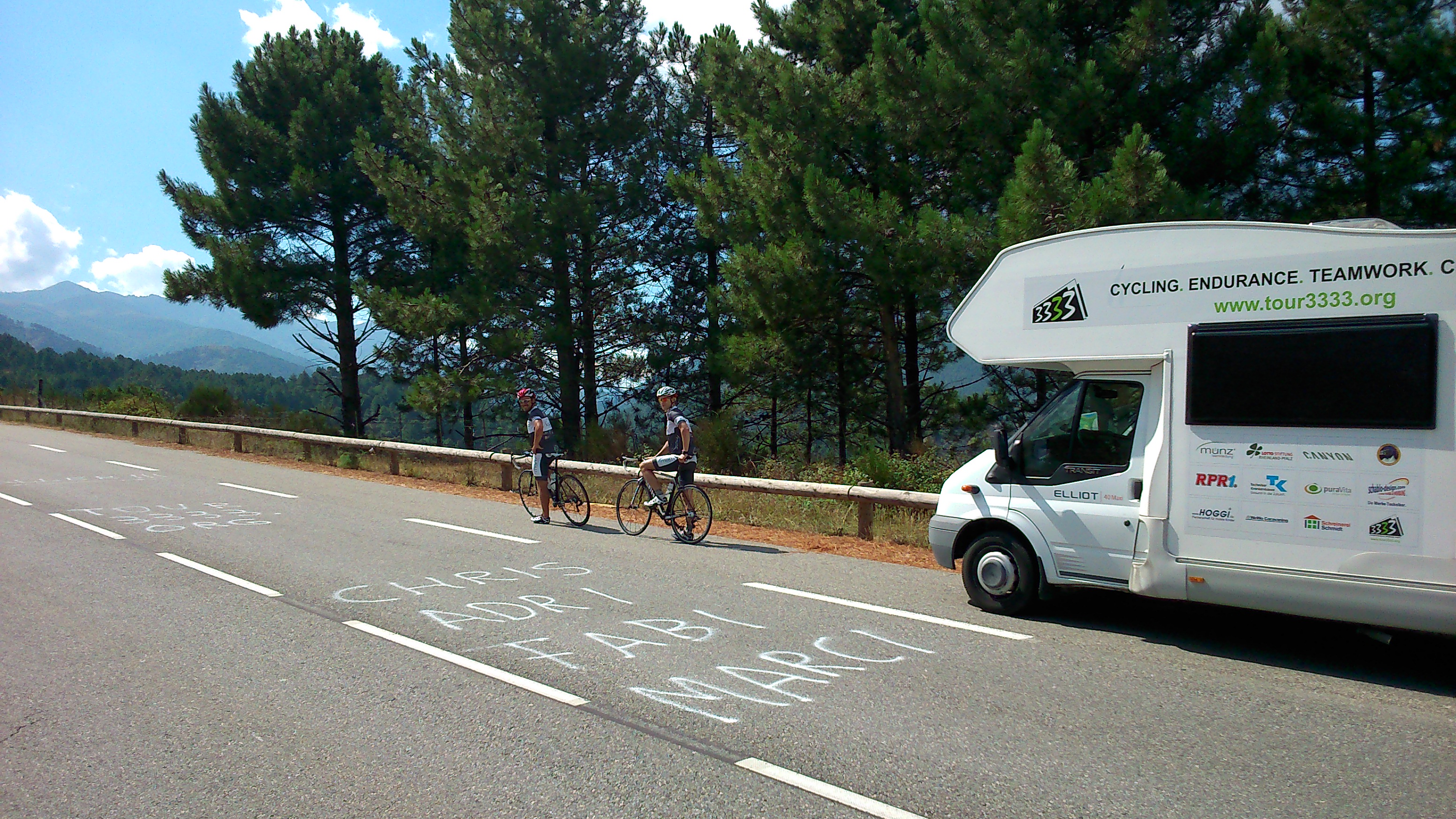 Auf dem Weg zum Vizzavona wurden wir auch durch Hanjo und Anja überrascht. Sie sind früh morgens aufgestanden und auf den Berg gefahren, um mit Sprühkreide eine Anfeuerung für uns auf der Straße zu hinterlassen, wovon wir vorher nichts wussten! Nicht erwartet, eine schöne Aktion, um nochmal ein paar Watt mehr treten zu können :). Ein Video davon wird auf facebook.com/Tour333 sehen zu sein.