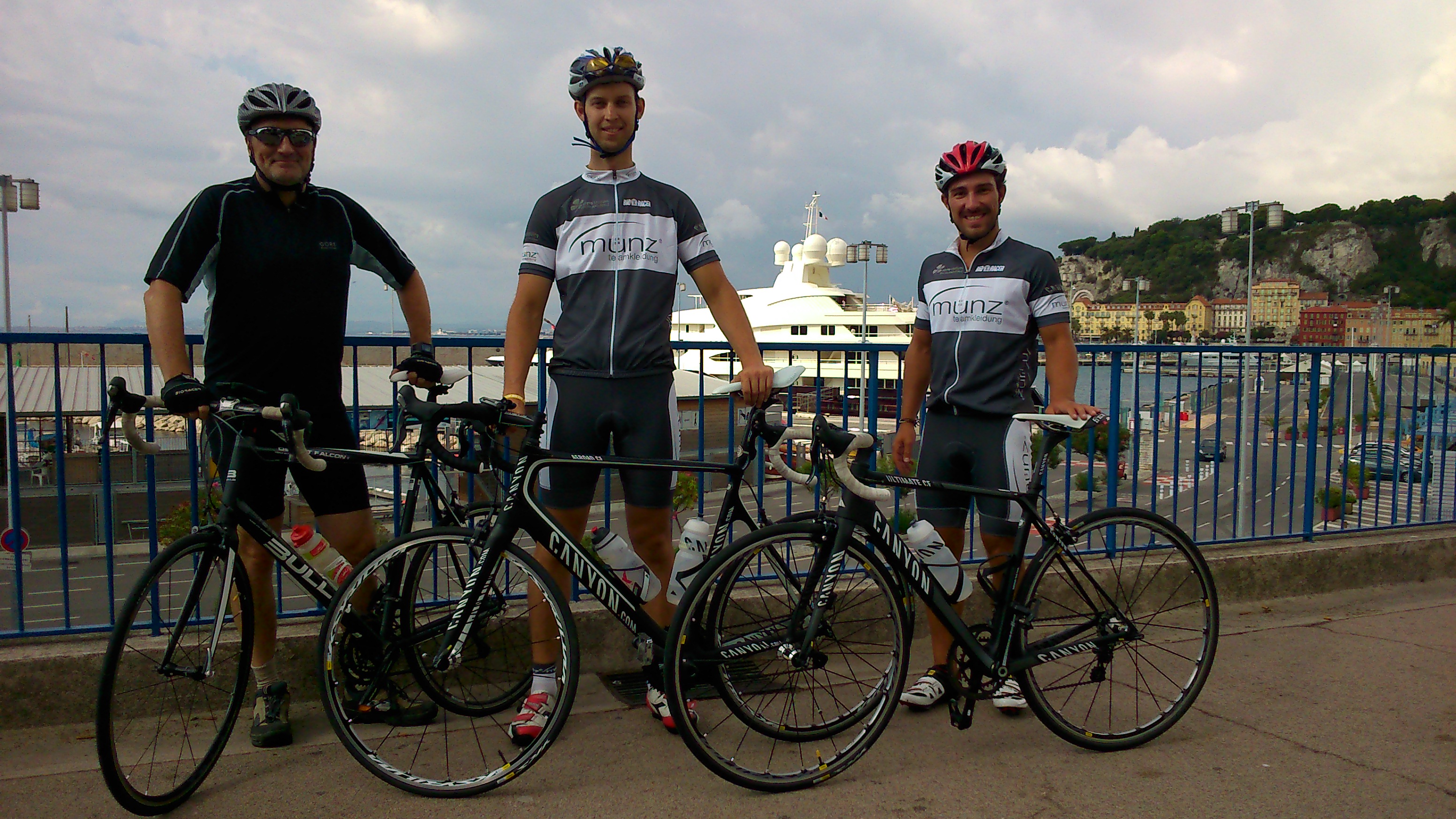 Zunächst das Frühstück mit Rainer, der sich aufgrund seiner Erkältung langsam erst an das Radfahren herantastete. Nach langem Suchen mit dem Wohnmobil zwischendurch haben wir eine Parkbucht gefunden, nachdem wir des öfteren an Parkplätzen abgewiesen wurden, sei es durch eine zu geringe Durchfahrtshöhe oder Personal, das eine Einfahrt verbot. Nicht einfach, in dieser dicht besiedelten Stadt eine Stelle zu finden. Zwischen unzähligen Gebäuden führen schmale Gassen und ein paar Hauptverkehrswege. Nicht überall ist es so sauber, wie man es sich vielleicht als Auswärtiger zuvor vorgestellt hat. Doch die Präsenz unzähliger Millionenyachten im Hafen zeigt, dass man hier zeigen möchte, was man hat. Wie wir mit unseren Canyon Rädern – entlang der Strandpromenade :). Zunächst fuhren Marcel und Adrian die 25 km der Zeitfahretappe in Nizza. Es ging an der Promenade entlang, wo sehr viele ambitionierte Freizeitsportler schon früh unterwegs waren. Am Flughafen von Nizza, nahe am Meer gelegen, verlief die weitere Route ein Stück nach Norden. Nach einer Kehrtwende ging es dann wieder entlang des Meeres, auch am „Le Miami Beach“, auf der flachen Etappe in Richtung Hafen, wo das Ziel der Strecke war.