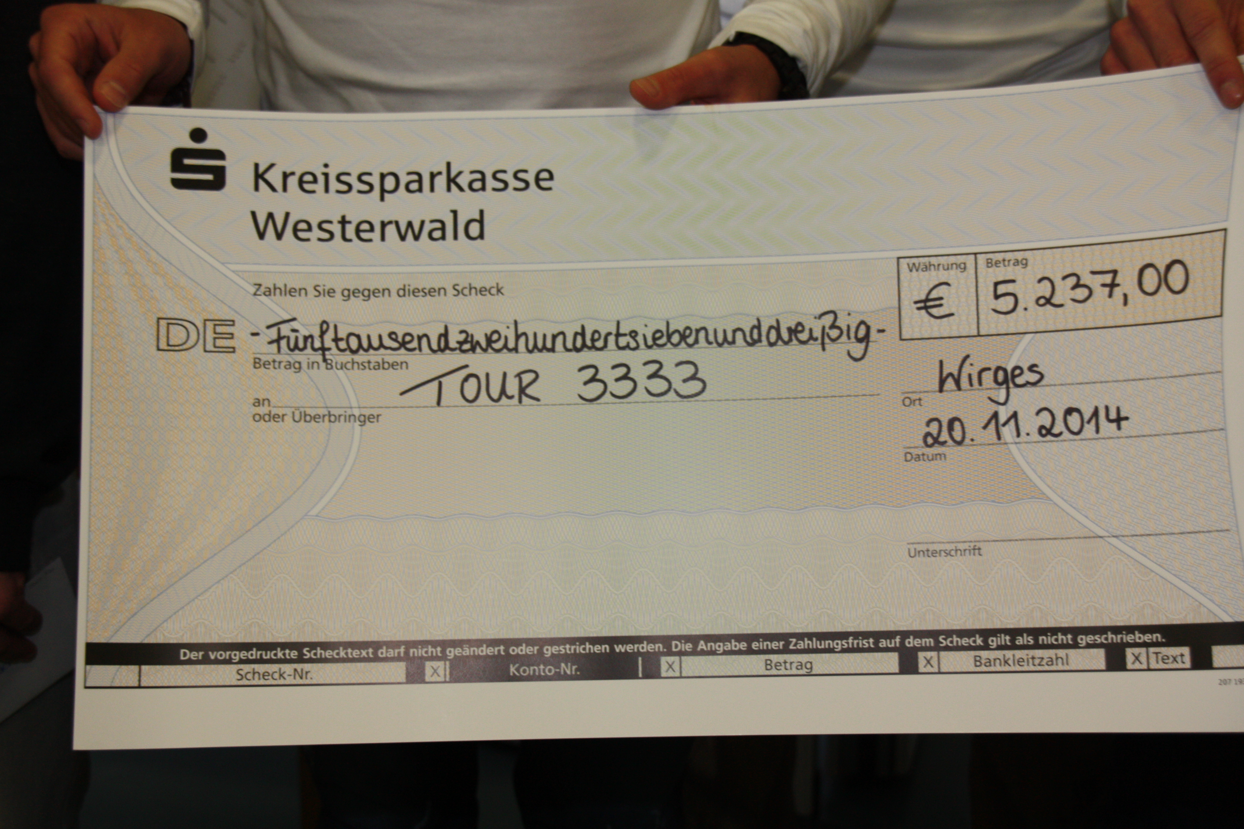 Es wurde der Wunsch geäußert, die gesammelten Spenden aus dem Lauf regionalen Projekten zukommen zu lassen. So war es die Idee von Judy Klima, Lehrerin an der Theodor-Heuss-Realschule Wirges, einen Teil des Geldes an Tour 3333 zu übergeben. Wir unterstützen mit dem Projekt drei Organisationen in unserer Region: Haus der Jugend Montabaur, ambulantes Kinderhospiz Koblenz sowie das Kinder- & Jugendheim „Seraphisches Liebeswerk“ Arenberg!
